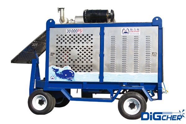 德高潔 DJ 2000/20DT 2000公斤壓力進(jìn)口柴油超高壓清洗機(jī)采用康明斯95kw柴油發(fā)動(dòng)機(jī)作為動(dòng)力源,高壓泵為美國原裝三柱塞泵,設(shè)計(jì)有三級(jí)進(jìn)水過濾器,并采用特種不銹鋼泵頭、不銹鋼閥門及柱塞、高技術(shù)密封填料;曲軸箱采用飛濺潤滑;設(shè)計(jì)有變頻調(diào)速系統(tǒng);配備氣動(dòng)旋轉(zhuǎn)槍;安全閥采用爆破膜式,安全可靠。